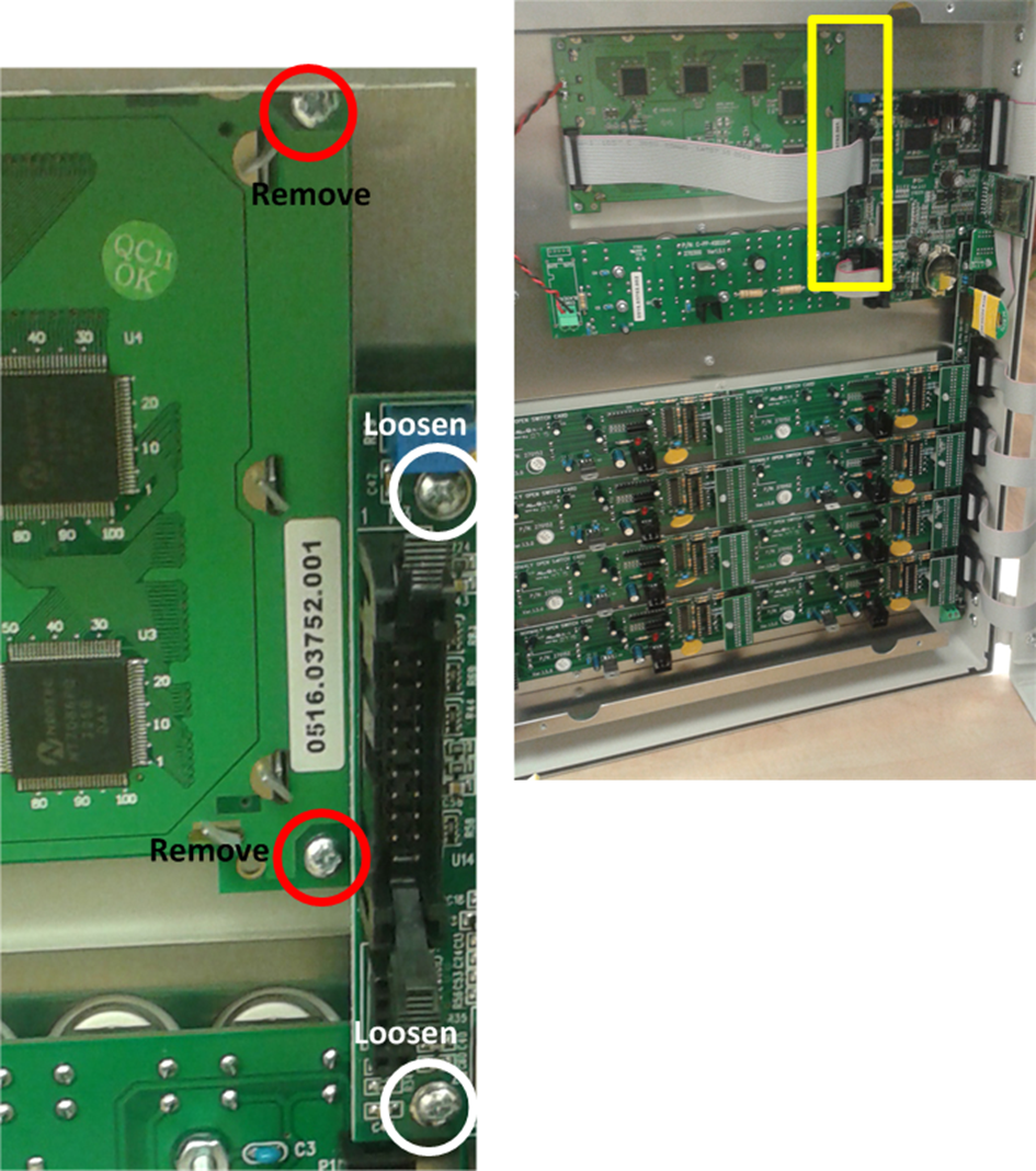 Platinum XLでは、2つのLCD金属ねじがDig COMポートとPlatinumのGNDの間に短絡を引き起こす可能性があります。この短絡を防ぐために、技術者はこれらの金属ねじを提供された代用品(プラスチックねじとプラスチックナット)に交換する必要があります(図2)。